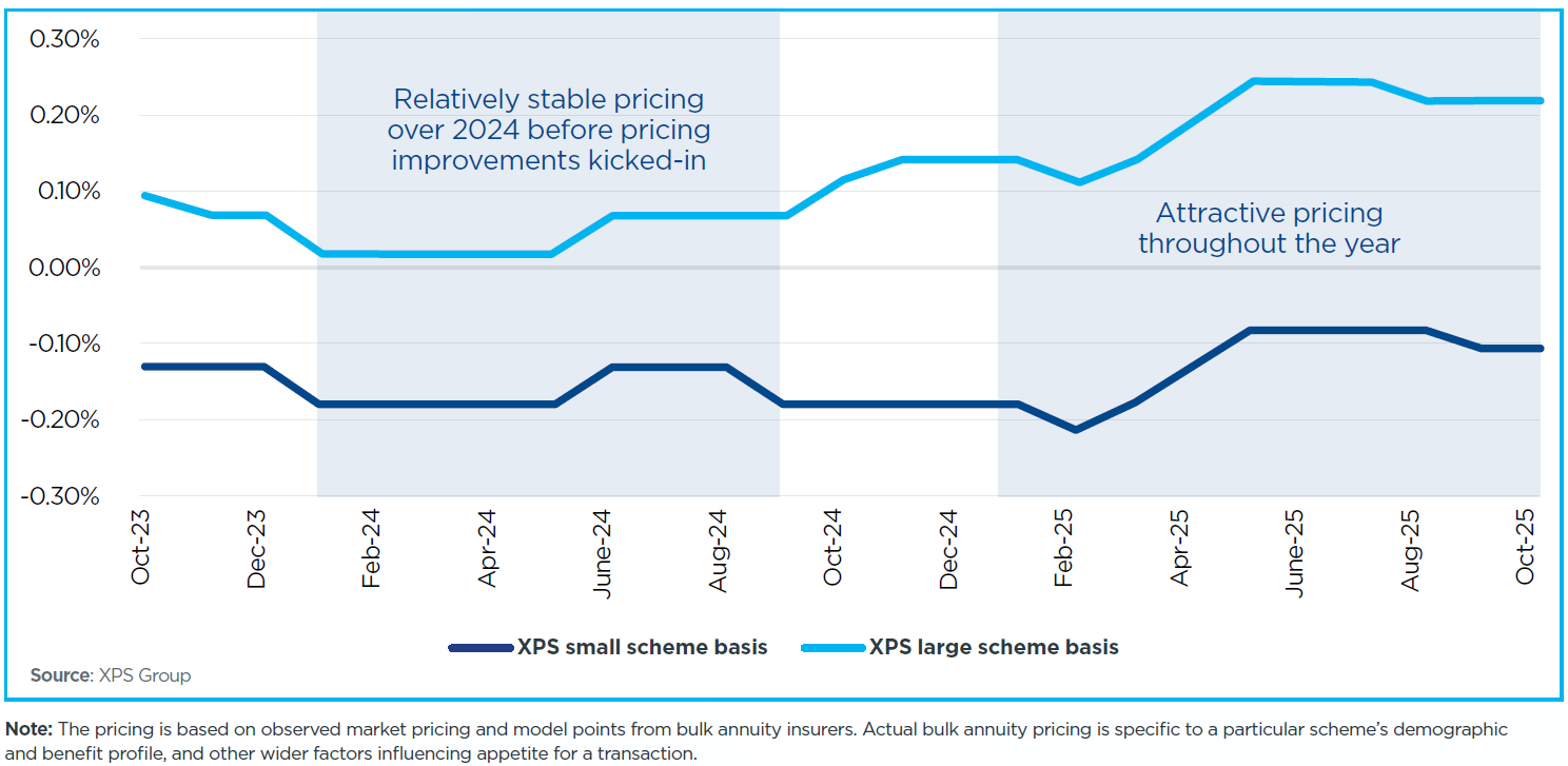 XPS market intelligence - we expect fewer multi £Bn transactions in the market for 2026, which will continue to create opportunities for smaller to mid-sized schemes where demand and competition remain strong. XPS’s experience remains that well-prepared schemes with well thought-out strategies continue to receive attractive pricing regardless of size, and for smaller to mid-sized schemes, there is currently an increased level of competition among insurers, driving that attractive pricing.