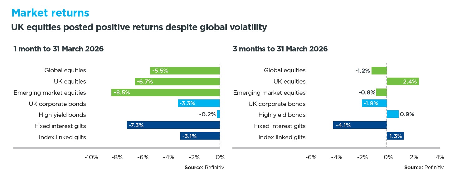 Equity markets had started 2026 in good form but the S&P 500, FTSE 100 and European Stoxx 600 have all suffered significant downturns since late February. UK equities still managed to post a positive return over the quarter on the whole, but global and emerging markets in particular were pared back by growing concerns over bloated AI-related stock valuations. Emerging markets have been particularly badly hit by the shortage of oil and gas.