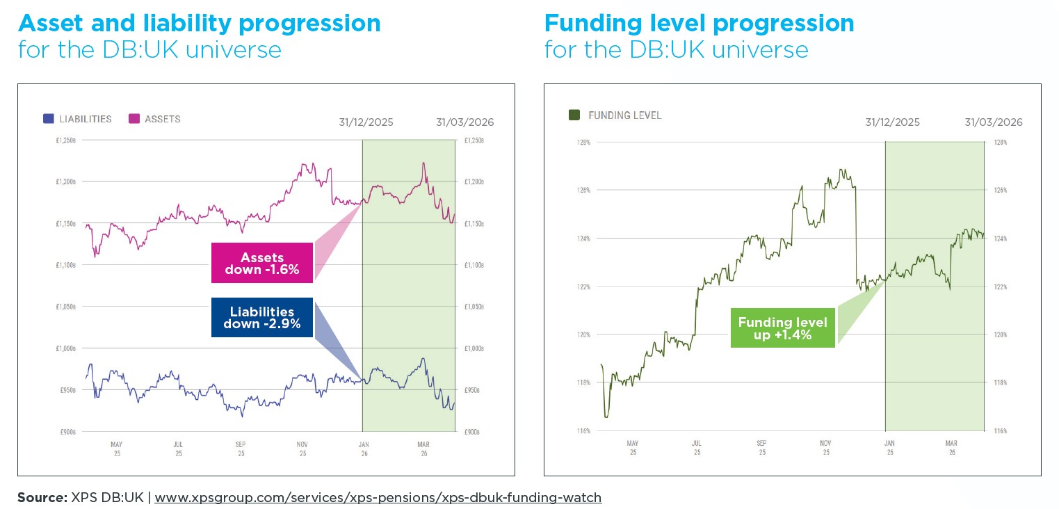 - Aggregate UK DB pension scheme funding improved marginally over the quarter