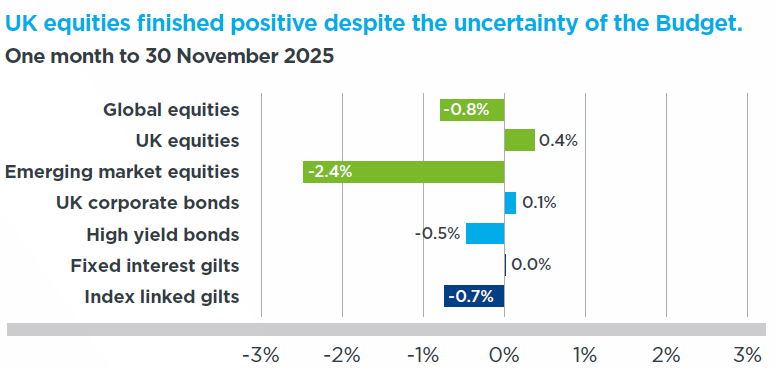 Emerging market equities fell over the month, a blip in an otherwise strong year, having outpaced global equities so far in 2025 driven by a cheap dollar and offering appealing sector exposures such as precious metals. UK investment grade corporate bond spreads rose marginally in the run up to the budget and then drifted back, ending November slightly higher than at the start. Fixed interest gilt returns were flat over the month whilst indexlinked gilts were negative as long-term inflation expectations came down.