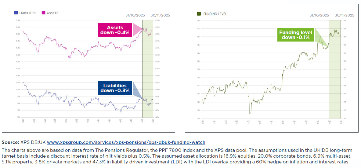 Aggregate funding for UK DB pension schemes on a low-risk basis ended the month largely unchange over November, with no particular aspect on the liability or asset side moving the dial.