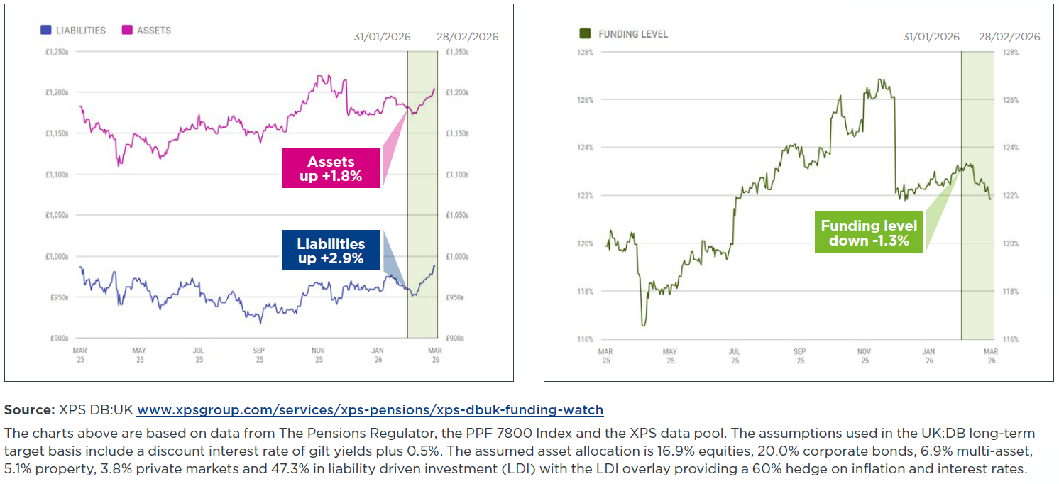 As things stood at the end of February, long-term UK government bond yields had actually fallen by around 0.2% over the month. This was in part driven by projections that new UK government debt issuance is set to fall for the first time in four years in 2026. With inflation expectations broadly flat over the month, strong returns from growth assets were not sufficient to offset the impact of rising liabilities on aggregate UK DB pension scheme funding, which is expected to have fallen on a low risk basis over February. Aggregate funding on this basis remains in a healthy surplus, however.
