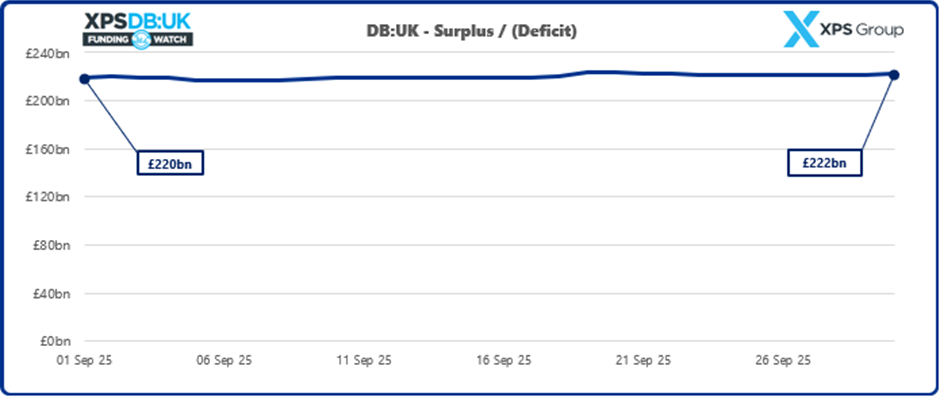 - XPS Group estimates UK DB pension schemes maintained a £222bn aggregate surplus against long-term funding targets, up £2bn in September 2025 and £48bn year-on-year.