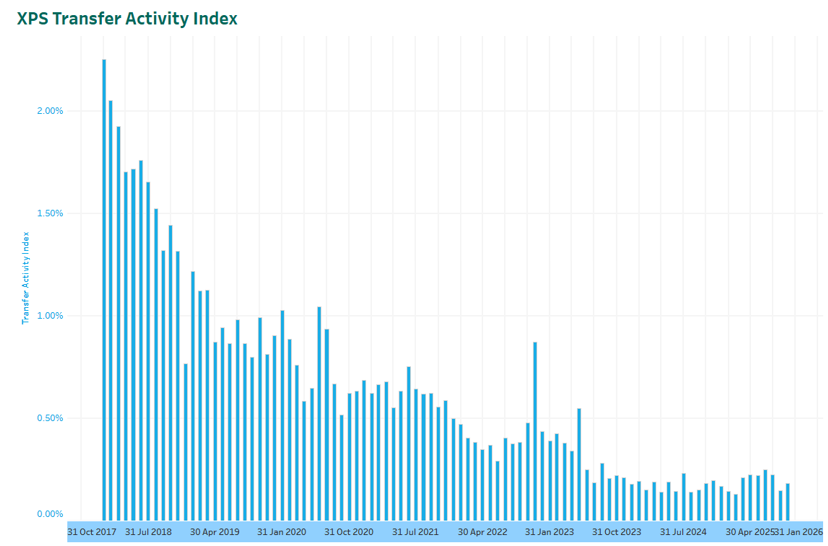 XPS Group’s Transfer Activity Index represent the annualised proportion of members that transfer out of pension schemes administered by XPS. If replicated across all private sector, funded, UK DB schemes, this indicates that approximately 10,000 DB members leave their schemes each year